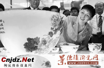 圖為展會上,唐山海格雷骨制瓷有限公司精心制作的25寸精美的骨瓷超薄巨碗引起了觀眾的極大興趣。該碗價(jià)格在6萬元人民幣之上。