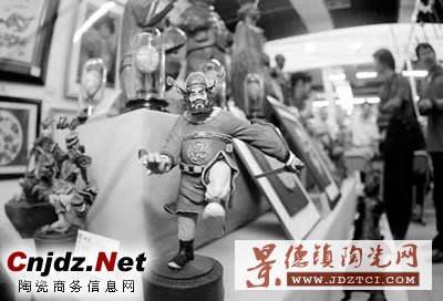 景德鎮(zhèn)“藝博齋”展位,展出了直徑1.16米、標(biāo)價(jià)28萬元的“九龍紋描金祭藍(lán)大盤”,令人拍案稱奇。江西民間工藝美術(shù)大師鄔書遠(yuǎn),將云南瓦片“龍鳳呈祥”圖案、北方剪紙“吉慶有余”圖案等民間藝術(shù),首創(chuàng)用于青花瓷器上。