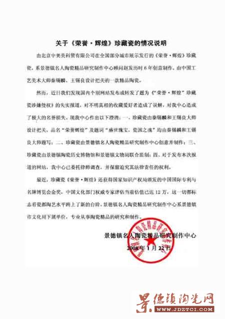 針對(duì)有關(guān)《榮譽(yù)·輝煌》珍藏瓷涉嫌侵權(quán)的報(bào)道,制作方景德鎮(zhèn)名人陶瓷精品研究制作中心向收藏緊急發(fā)來聲明,內(nèi)容如下: