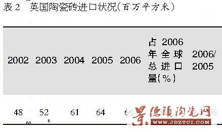 2006年英國進(jìn)口陶瓷磚總量為66百萬平方米,位居全球第五位!排在美國、法國、德國、沙特阿拉伯之后。