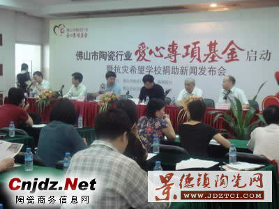 2008年6月3日下午,由佛山陶瓷行業(yè)協(xié)會(huì)、陶城報(bào)社共同主辦的“佛山市陶瓷行業(yè)愛(ài)心專項(xiàng)基金啟動(dòng)暨抗災(zāi)希望學(xué)校捐助新聞發(fā)布會(huì)”在中國(guó)陶瓷城四樓會(huì)議廳隆重舉行。