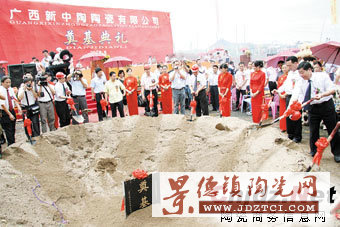6月27日,廣西梧州藤縣藤洲鎮(zhèn)內(nèi),龍獅起舞、彩旗飄揚,一派喜慶的景象,匯能礦業(yè)集團旗下的廣西新中陶陶瓷有限公司在此隆重舉行奠基典禮。出席奠基儀式的有自治區(qū)和梧州市領(lǐng)導(dǎo);市經(jīng)委(招商局)、建規(guī)委、發(fā)改局、環(huán)保局、國土局、安監(jiān)局、質(zhì)監(jiān)局、供電局等部門領(lǐng)導(dǎo);縣四套班子領(lǐng)導(dǎo)、縣直部門及鄉(xiāng)鎮(zhèn)領(lǐng)導(dǎo)、縣內(nèi)企業(yè)代表,廣西新中陶陶瓷有限公司董事長廖偉康、執(zhí)行董事廖偉良、總經(jīng)理龐景成等領(lǐng)導(dǎo)及客商、桂、粵兩地新聞單位等近1000人。