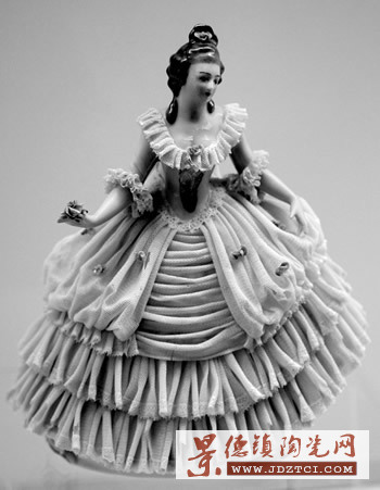 如今,歐洲瓷器與中國瓷器已經(jīng)長成完全不同的兩棵大樹了。中國歷史上的瓷器大多造型簡潔、用色單一,而歐洲瓷器造型寫實(shí)、色彩豐富,瓷器的用途也被擴(kuò)展到許多裝飾及實(shí)用物品上,包括照明、書寫工具和家具等。張嵐說:“這次展出了不少歐洲藝術(shù)瓷,在中國瓷器史上很少見。”他指著一座出產(chǎn)于德國德累斯頓的人物造型瓷說:“這個(gè)作品追求寫實(shí)的藝術(shù)風(fēng)格,人物身上的紗裙,是把絲織物放進(jìn)瓷土中燒制而成,遠(yuǎn)看和真的紗裙一樣,其實(shí)質(zhì)地是瓷器,這種工藝是當(dāng)時(shí)的中國所沒有的。”