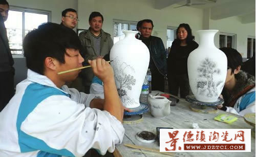 當天上午,受邀觀展人員在第一中專相關(guān)負責人的帶領(lǐng)下,走進學校實踐車間,在這里,捏雕、拉坯、利坯、彩繪等各工序的學生正在認真創(chuàng)作著。參觀人員不時地與他們進行交流!耙癞媷嬕粯,青花料不要太干……”上世紀90年代畢業(yè)于陶瓷職業(yè)技術(shù)中專(第一中專前身),從事多年陶藝工作的洪小強在觀看過程中不時地指點學生一些繪畫技巧。