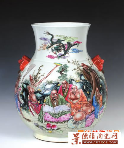 景德鎮(zhèn)陶瓷網(wǎng)訊:在珍藝堂所收藏的眾多廠瓷精品中,有這樣兩個瓷瓶尤為引人關(guān)注,它們分別為墨彩描金人物瓶和獸耳粉彩羅漢瓶。這兩件瓷器均創(chuàng)作于原藝術(shù)瓷廠,無論從制作工藝,還是從藝術(shù)水準(zhǔn)上來說,其都有著極高的收藏價值,是廠瓷中不可多得的精品。