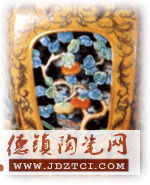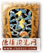 這件作品通體施紫金釉,在口足部施金釉,包括鏤空都在表明仿金屬工藝效果。紋飾中西合壁,雙鉤西番蓮,鏤空靈芝、佛手、壽桃紋.由此可以看出當(dāng)時中國陶瓷所受西方文化的影響。