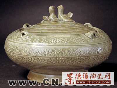 蓋缸斂口,扁腹,圈足外撇,肩部四面各飾一條形系。外壁模印菱形錦地網(wǎng)格紋,間飾劃線弦紋。器物內(nèi)外皆施青釉,圈足內(nèi)素胎無(wú)釉。蓋圓形,蓋口可以合于缸口內(nèi)。蓋面飾3周凹陷的寬弦紋,蓋頂?shù)袼芤粚?duì)小鳥(niǎo),情態(tài)活潑可愛(ài),展翅翹尾相對(duì)而立,栩栩如生。