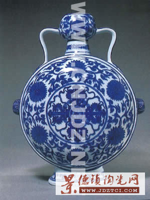 清代官窯瓷器有不少種類的紋飾和圖案,各有特色,令人賞心悅目。像附圖是十八世紀(jì)清代的青花雙如意耳和蒜頭口扁壺,繪法輪纏枝蓮紋。