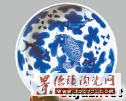 盤徑28厘米,撇口、淺腹、胎質(zhì)細(xì)白、釉色亮青,釉下用青花繪四種魚類和水藻,象征吉祥如意,青花發(fā)色藍(lán)艷,從其器型、胎釉、青花呈色等方面分析,應(yīng)為清代康熙晚期景德鎮(zhèn)民窯燒制,惜盤沿有殘缺,其市價在千元左右。