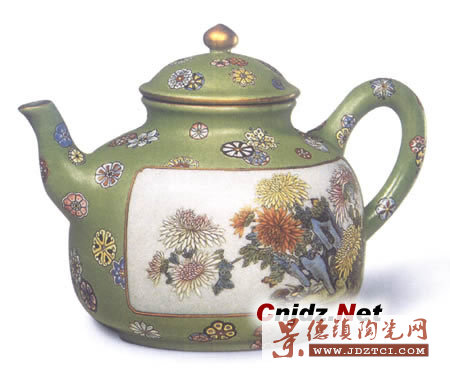 > 粉彩綠地開(kāi)光菊花紋茶壺