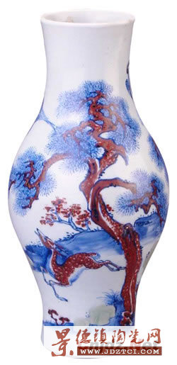 釉里三色是指以青花、釉里紅與豆青釉作畫的富有新意的瓷器品種,統(tǒng)稱為“釉里三色”或“釉里三彩”。古代以仙鶴和鹿的壽命長,寓意吉祥,而出現(xiàn)于瓷器圖案或繪畫圖案之中。