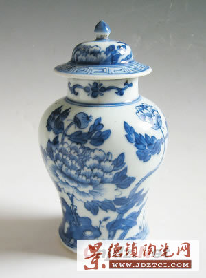 這件青花罐高度僅有20多厘米,但造型挺拔俊美,罐體腹部描繪了兩支盛開(kāi)的牡丹花,這種瓷罐的蓋子形似古代將軍的頭盔,因此文博界形象地將其稱為“將軍罐”。
