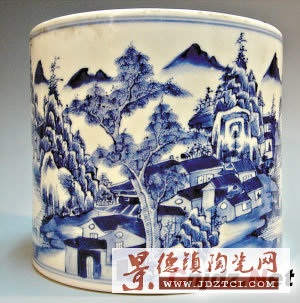 ●康熙青花山水紋筆筒可看到清晰的水紋,生動(dòng)有力。