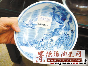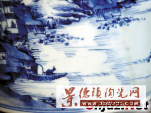 仔細(xì)觀察可見(jiàn)仿制品的紋飾散亂,而且畫工甚為粗糙。真品就完全不同,如“康熙青花山水紋筆筒”,繪畫明顯有著“清初四王”(指四大王姓的書畫名家王原祁、王時(shí)敏、王鑒、王翚)的筆意(這是康熙晚期山水人物青花特點(diǎn)之一),而仿品看不出章法。從局部對(duì)比,新仿青花山水紋筆筒的江水不見(jiàn)任何紋路,只是混沌一片;民國(guó)仿康熙山水紋筆筒的江水稍有紋路,但仍是一片模糊;而康熙青花山水紋筆筒便明顯可看到清晰的水紋,生動(dòng)有力,畫工之精粗一比較便有明顯結(jié)論。