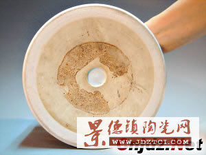 康熙青花山水紋筆筒底部就是一個(gè)典型的例子:1.底部形成俗稱的“壁底”;2.半露胎、中間有釉,在底部形成三圈,中間一圈沒(méi)釉;3.底部在燒制時(shí)因?yàn)楦邷厥芾涫湛s而形成“桔皮棕眼”。