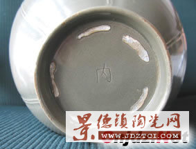 本件藏品是一件五代越窯瓜棱云紋雙系梅瓶,瓶高31厘米。梅瓶是古代的儲酒器,釉色為典型的艾青色,通體施釉,圈足支燒,底部陰刻“內(nèi)”字(見圖),可見這件作品是當時供“內(nèi)府”使用的官窯器。整件梅瓶刻有六條瓜棱線,并在瓶體上以本色釉劃刻六朵飄帶立云紋,瓶肩部塑二圓孔,便于穿繩系帶,瓶口外卷,亭亭玉立,美不勝收。五代梅瓶與后世梅瓶稍有不同的是口頸稍長、肩腹較寬,并帶有雙系,這是梅瓶初創(chuàng)時期的特征,不過那時這種作為酒具的窯器,不稱梅瓶,而叫酒經(jīng)、經(jīng)瓶,至晚清“梅瓶”稱謂才出現(xiàn),因其小口僅能容納一枝梅而得名。