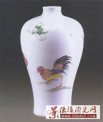 小口,豐肩,圈足微撇,粗沙底,形制秀美。腹部繪粉彩奇石、花卉、墨竹、彩蝶、雙雞圖,蘊(yùn)含“官上加官”之美好寓意。繪畫(huà)精細(xì),色彩豐富,題材新穎。
