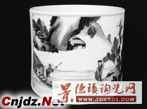 康熙的翠毛藍(lán)青花,艷麗亮翠濃淡相宜、色調(diào)豐富層次分明,真正體現(xiàn)了中國傳統(tǒng)水墨畫的無窮韻味?滴醮涿{(lán)青花是我國青花瓷器藝術(shù)品中的奇珍。年初筆者在上海一家古玩店里看到一只康熙青花大筆海,形制端莊挺拔,胎骨如脂似玉,釉面粉白細(xì)潤。該筆海滿工,正反兩面為白描人物紋飾,人物造型飄逸傳神。背景采用水印指捺紋皴法,青花發(fā)色青翠艷麗,濃淡過度自然,且墨分五色,透視感極強。筆者揣摩當(dāng)是一件難得的康熙翠毛藍(lán)青花瓷,經(jīng)店主應(yīng)允得以拍照存寶。