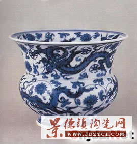 正德皇帝荒于政事,明朝國力從此由盛轉(zhuǎn)衰,青花瓷器也隨之由頂峰轉(zhuǎn)向下坡。青花料除用平等青、石子青外,后期開始使用“價倍黃金”的回青。正德瓷器的繪畫手法非常精練,細描勻染,圖案生動精致。2004年4月香港蘇富比拍的一件正德青花穿花龍紋盤,直徑19.5厘米,成交價118萬港幣。穿花龍紋的使用,在正德時期非常盛行。所繪龍紋穿行于纏枝花中,纏枝花紋勾邊不留白,布局飽滿。這種畫法成為正德時期一種獨特的紋飾風格。