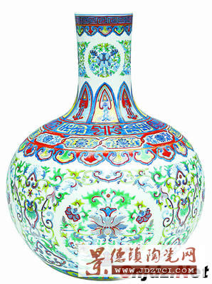 這件清乾隆青花斗彩描金花卉紋天球瓶,原物早已流失海外,現(xiàn)藏于日本松崗美術(shù)館,經(jīng)與日方多次磋商,幾經(jīng)周折才把國寶“克隆”回國。此件物品是乾隆皇帝鐘愛之物,陳設(shè)于皇家最顯貴的地方。其胎潔白細膩,造型優(yōu)美,口沿描金錦紋,腹部纏枝開光團花紋,整個紋樣繁茂,線條工細而不失其生動有力,形象工整而不失其豪放和張力,色彩單純而不失華富和熱烈,是一種工藝性極強,最有繪畫功力,藝術(shù)水平極高的高檔陳列收藏品。