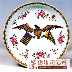 這件圓形瓷碟的口沿有一圈棕褐色的細花紋,里面則繪有大小不同的各種折枝花紋,紅花綠葉在白色底盤上顯得清新艷麗,瓷碟的正中央繪著一只展開雙翅的大鷹,鷹的兩只利爪各抓住一面旗幟;美國的星條旗和大清的黃龍旗,這是當時中美兩國的國旗。鷹的身上也繪有星條旗的圖案!苞棥焙汀靶菞l旗”都是美國的象征。廣彩瓷碟上出現(xiàn)鷹旗圖案,說明此碟應該是洋人訂制,出口到美國的。
