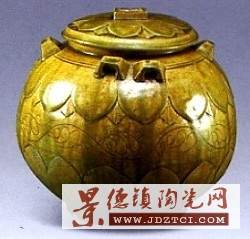 直口,短頸,頸最大處偏下,平底。肩部置6個(gè)橋形紐,前后兩對(duì),左右各1個(gè)。蓋面略鼓,蓋紐作長(zhǎng)方形,中有一小圓孔。此罐腹部和蓋面剔刻雙重蓮瓣紋,蓮瓣上覆下仰。此蓋罐為越窯系產(chǎn)品。