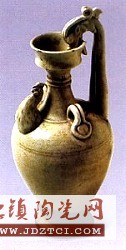 壺作盤口,細(xì)頸,頸部飾凸弦紋兩周。肩部豐滿,自肩以下腹壁逐漸內(nèi)收,至底部又外侈,平底。肩部向前伸出一雞首,高冠圓目,張口作啼鳴狀,頸上有印痕以飾羽毛。肩的后部向二伸出一把手,把端作璃首,張口銜壺之盤口,把為兩條形合成。肩的左石各有一系,作雙瓣重合形,下作一圓餅飾。肩與頸相交處有凸弦紋一周,腹部飾凹弦紋兩周。胎灰,施白色化妝土,透明釉。近底部及底無釉,器身有細(xì)小冰裂紋。