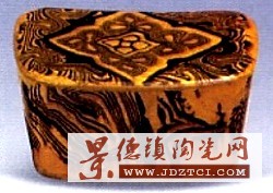 生活用品,此枕長(zhǎng)方腰圓形體,直身平底,枕面微內(nèi)凹。胎面貼塑黃、褐兩色紋樣,這種工藝名為絞胎,是以黃、褐兩種胎泥絞合在一起,形成花紋,貼于器物表面,施透明釉,燒成后即為絞胎器。絞胎工藝始于唐代河南地區(qū),盛于宋。所制成品有枕、盤、碗等,多為小件器。