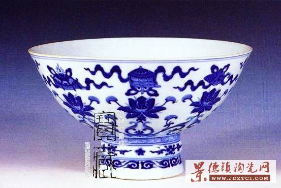 造型與“雍正斗彩蓮?fù)邪思榧y高足碗”相同,所繪主題紋飾也基本一致,但組合不一樣。此碗所飾“蓮?fù)邪思榧y”用變體如意云紋、蓮紋、八吉祥紋表現(xiàn);脛部的變體如意云紋處在下位,由蓮葉和朵花構(gòu)成,一仰一覆地托著中位的8朵蓮花,8朵蓮花托著八吉祥紋,由此形成一個(gè)整體。