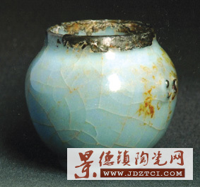 圖中所示粉青釉罐式鳥食缸,高5.8厘米,腹徑6厘米,口徑4.4厘米,底徑3.5厘米。釉色瑩潤凝脂,青中帶藍(lán),滿含寶光,薄胎厚釉的工藝顯露官窯的特質(zhì)。釉層中積聚著無數(shù)大小不一的氣泡,“聚沫攢珠”的特征印證了其官窯身份。小器大開片更覺稀罕,金黃色紋片紛崩迸裂,自然天成,真乃鬼斧神工。胎體堅致細(xì)膩呈褐黑色,施釉及底,修足規(guī)整,毫無拖泥帶水之感。僅1毫米底足露胎處光潔平滑呈鐵足,口沿包銀更顯精貴,包銀脫落處可見口沿施釉薄透呈現(xiàn)紫色,形成官窯典型的紫口鐵足。口徑大于底徑的造型不僅豐滿端巧,而且便于鳥啄食 內(nèi)底呈凹弧狀也是專為喂鳥設(shè)計 。可惜固定用的環(huán)把缺損,留下了四點露胎的疤痕,讓人感到世事滄桑的久遠(yuǎn)。宋代上層貴族文人崇尚理學(xué),返璞自然,其審美情趣趨向素凈高雅,講究器型的雍容和色彩的純正,摒棄裝飾的繁縟和習(xí)俗的低庸!昂喖s”是當(dāng)時的時尚,是美的最高境界。南宋官窯瓷器正是體現(xiàn)了上層人物的這種精神上空靈取向和物質(zhì)上奢華追求。小小鳥食缸見證了宋代的輝煌和衰落。
