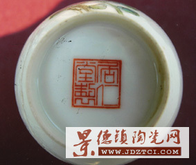 粉彩花鳥瓶(圖1、圖2)長頸、敞口、薄唇、溜圓肩、直弧腹、圈平底、內(nèi)圈足。瓶身略呈橄欖形。頸腹之間有兩處殘缺,外底部以紅彩銘“居仁堂制”四字篆書款,外加紅色邊框。銘文的筆道規(guī)整,線條爽利,紅彩色澤鮮艷。瓶通高14.3厘米,腹徑6.8厘米、口徑3.6厘米,底徑3.4厘米?芍潴w形極為輕巧。胎質(zhì)潔白細(xì)膩,其突出特點(diǎn)是:胎體極薄,最薄處不足1毫米,最厚處不足1.5毫米。手感特別輕巧,加上其體形較小,剛好以手一握,便于把玩?芍^小巧玲瓏,精致可愛。