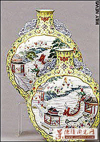 兩個扁瓶高11寸,瓶身畫了河岸景色,一群小孩迎著河上一條龍舟歡呼雀躍。扁瓶黃邊上雕有花紋圖案。其中一個花瓶完好無缺,但另一個的瓶頸有損毀,曾經(jīng)修補過。在專家鑒定其為乾隆年間燒制的真品后,拍賣起價為5,500英鎊(約8.7萬港元),但幾分鐘后叫價已達35萬英鎊(約554萬港元),至少有2名華人參與競奪,其中一名香港商人的兒子在叫價升至35萬英鎊時退出。