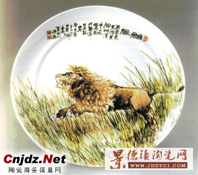 近代中國(guó)外憂內(nèi)患不斷,帝國(guó)主義列強(qiáng)侵略、瓜分中國(guó),但國(guó)人處于麻木不覺(jué)悟狀態(tài)。這一社會(huì)現(xiàn)實(shí)在陶瓷詩(shī)里都有所反映,F(xiàn)藏于中國(guó)歷史博物館的一件瓷碗,碗壁繪一人臥于石上酣睡,一猛虎正向其撲來(lái),還有二虎正在撕斗。一面題跋:“餓虎回至,我睡猶酣,雄雞一鳴,人夢(mèng)咸醒”。有人燒制繪有醒獅的瓷盤,期待有人喚醒中國(guó)這頭睡獅(下圖)。反動(dòng)統(tǒng)治階級(jí)的殘酷剝削和壓迫,加上持續(xù)不斷的天災(zāi)人禍,老百姓生活在水深火熱之中。景德鎮(zhèn)燒制的題為《漁》和《耕》的瓷板畫(作者為王大凡)題寫的詩(shī)反映了舊中國(guó)這一社會(huì)現(xiàn)實(shí):“撒網(wǎng)無(wú)魚蝦,官稅不能賒;網(wǎng)來(lái)難換米,空坐對(duì)蘆花”!叭q遭荒旱,今春又決堤;終年耕褥者,不得飽妻兒”。