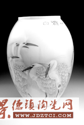 讓裝飾繪畫與瓷器更完美地結(jié)合,這是李游宇創(chuàng)作漢光瓷“白鳥”系列的一種想法,一種探索,他選擇了鷺鷥、和平鴿、丹頂鶴、鸚鵡等白色鳥為題材,在白色里找灰層次,在釉下彩里作沒骨與工筆。