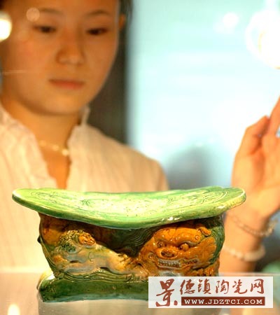 8月3日,“盛夏華章精品拍賣(mài)會(huì)”拍品預(yù)展于北京亞洲大酒店舉行,據(jù)主辦方介紹,本次預(yù)展品分千年古瓷枕、明清瓷器、佛教藝術(shù)品、名品紫砂壺與陳年普洱茶等專場(chǎng)。其中“千年夢(mèng)華──古瓷枕”專場(chǎng)最為搶眼,展出中的唐、宋、金時(shí)期陶瓷枕,不少是從海外征集而來(lái),具有極高的藝術(shù)價(jià)值和商業(yè)價(jià)值。據(jù)悉,拍賣(mài)會(huì)將于8月5日在京開(kāi)槌,屆時(shí)除古瓷枕之外的展品均參與競(jìng)拍。圖為工作人員在展示一款金代的“醬黃絞釉雙獅形枕”。