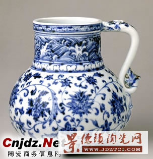 此花澆青花色澤濃艷,有黑色結晶斑。其造型風格系仿西亞黃銅壺器物。