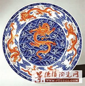 青花礬紅彩始于明初宣德時期,常見圖案為海水行龍或海獸。它的做法是先在釉下用青花描繪海水,留出行龍或海獸紋的空白地,高溫燒成后再在空白地上用礬紅彩補齊圖案,然后低溫二次燒成。在青花的襯托下,礬紅彩愈顯得艷麗奪目,能取得更好的裝飾效果,色澤艷麗,對比強烈。釉下青花與釉上紅彩的結合是中國制瓷史上的里程碑,為五彩、斗彩等的發(fā)展奠定了基礎。