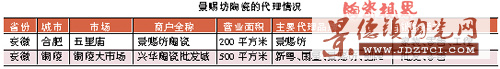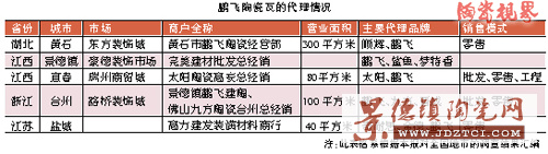 鵬飛建陶生產(chǎn)的主要產(chǎn)品有“鵬飛”牌、“卡迪克”牌雙拱連鎖陶瓷瓦和“景賜坊”牌地面磚!熬百n坊”牌地面磚雖然現(xiàn)在已有6個(gè)規(guī)格300多種花面,但是渠道建設(shè)還有很大的提升空間。根據(jù)本報(bào)的調(diào)查,只有安徽的合肥以及銅陵兩地有經(jīng)銷(xiāo)商代理其產(chǎn)品。鵬飛牌的經(jīng)銷(xiāo)網(wǎng)點(diǎn)稍微多一點(diǎn),在湖北黃石、江西宜春、浙江臺(tái)州、江蘇鹽城以及景德鎮(zhèn)本地都有代理點(diǎn)。