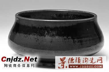 明永樂黑釉羅漢爐,高7.6厘米,直徑17.2厘米,內口徑13.3厘米,鼓腹、束頸、圈足。爐身光潔,中腰一段呈烏金釉,釉光可鑒,同時朝口沿和爐底上下兩方面折射,釉色由深黑變?yōu)楹稚,中間還有自然交叉的過渡,輕重相間,濃淡相生,疾緩相調,使原本較為沉悶的黑色具有了生命,活了起來。爐口沿為滿釉,平口沿中間施黑釉,兩邊為褐色釉,但銜接得天衣無縫,釉色能做到如此這般自然,可謂極也。內壁施半釉,留有一圈烏金釉,露胎處可見拉坯痕跡。爐底為外撇式八字形淺圈足,露胎,瓷土潔白細膩,偶有泛火石紅斑,修胎平整精細。底部還挖有一條凹邊,富有立體感,以手拭之頗為鋒利。胎體的銜接痕幾乎看不見,可見工匠制作之精細,而元朝與明初時器物的接口則相對較為明顯。