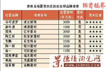 目前進駐鄭州市場的仿古磚品牌主要有馬可波羅、羅馬利奧、金意陶、樓蘭、陶藝軒、瑪拉茲等近50個。今年剛進入鄭州的仿古磚品牌主要有瑪拉茲、丹力士、華鴻和哈伊馬角等近十家。鄭州經(jīng)營仿古磚的商戶多為實力商戶。