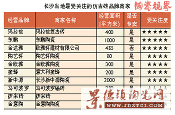 最近幾年湖南地區(qū)刮起了仿古風,消費者對仿古磚品牌的熱度有增無減。雖然商家普遍看好仿古磚的發(fā)展前景,但長沙仿古磚銷量仍下降了5%左右,常德、郴州等二、三級市場銷量降幅在15%左右。長沙地區(qū)建陶共400家,專賣和兼營仿古磚的商家有70家,占建陶商家的17.5%,這一比例在地市級市場則更高。目前長沙仿古磚的專賣商家有32家,主要品牌包括:瑪拉茲、金意陶、羅馬利奧、樓蘭、陶藝軒、雅士·高夫。長沙仿古磚品牌眾多,可選性強,競爭也較為激烈。
