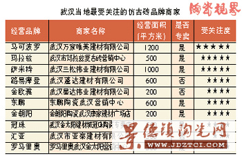 武漢市場上經(jīng)營仿古磚的商家占到了所有建陶商家的60%以上,但真正有實力的仿古磚商家并不多,甚至還有很多商戶一直靠“炒貨”生存。不過,像馬可波羅、瑪拉茲、金意陶等以仿古磚經(jīng)營為主的專賣店,在武漢市場上還是比較受歡迎的。但由于雜牌、低檔次仿古磚對市場有一定的沖擊作用,消費者廣泛接受仿古磚還需時日。