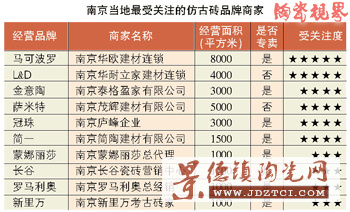 “仿古磚市場前景我們非?春谩,這是南京陶瓷經(jīng)銷商普遍的觀點(diǎn)。記者走訪南京各大陶瓷市場調(diào)查了解到,目前,在南京市場上主要的仿古磚品牌有馬可波羅、羅馬利奧、金意陶、簡一、L&D、長谷、道格拉斯、陶藝軒、金朝陽、路易摩登、圣陶坊、冠珠、蒙娜麗莎、瑪拉茲、薩米特等不到20個(gè)。
