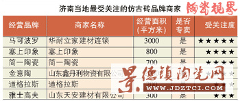 濟(jì)南經(jīng)營仿古磚的品牌主要有馬可波羅、塞尚印象、簡一、金意陶、雅士·高夫、道格拉斯等。商家約有80家,占到總建筑陶瓷商戶的25%。其中仿古磚專賣的商家占經(jīng)營仿古磚商家的10%,主要有馬可波羅、塞尚印象、簡一、金意陶、雅士·高夫、道格拉斯等品牌。