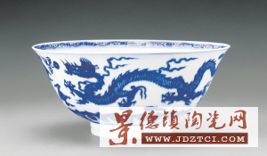 明代永樂年間是明清最重要的青花瓷產(chǎn)期,永樂青花主要用“蘇麻離青”鈷料,經(jīng)過適當(dāng)?shù)臏囟榷尸F(xiàn)色澤鮮艷的寶石藍(lán)色,并伴有自然的暈散現(xiàn)象。在紋飾上,永樂瓷器構(gòu)圖形式多樣,豐富多彩,均給人以清秀之感。諸多特征使永樂瓷器成為了國際各大博物館以及藏家的必藏之物。此件青花暗刻云龍紋碗,口沿微外撇,弧腹圈足。內(nèi)口沿一圈纏枝草葉紋,內(nèi)壁模印雙龍趕珠紋,碗心雙圈內(nèi)飾云龍紋。碗外壁主題紋飾為雙龍趕珠紋,青花略有暈散,近底處為蓮瓣紋。此碗從青花發(fā)色、紋飾構(gòu)圖、器形胎釉等方面來看,均符合永樂時期青花瓷之特點(diǎn),且采用內(nèi)模印、外青花的裝飾手法較為少見,故此其為難得的永樂官窯精品瓷器。北京故宮博物院藏有相類似的瓷器。