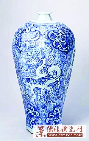 這是一尊別具特色的青花梅瓶,八邊形的瓶身上繪著四條白龍,在以青花繪成的海水于火焰中升騰而起。繁縟的花紋與龍身留白的簡潔使主體紋飾更加突出,體現(xiàn)了元代青花瓷器中非常有特色的表現(xiàn)方式。瓶肩部的云肩紋內(nèi),繪著象征富貴與吉祥的鳳穿牡丹和麒麟穿牡丹的圖樣。近足處的如意云頭紋里也畫滿了牡丹花葉。此瓶雖然紋飾布局繁密,但是主次分明,很有元代青花瓷莊重、飽滿的感覺。