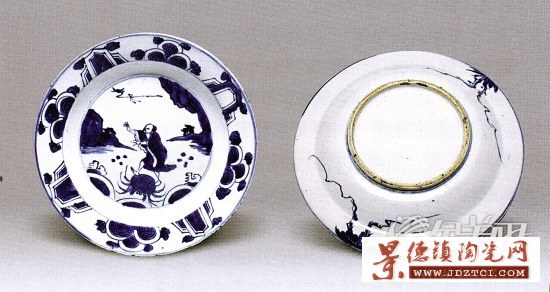 紋飾上的特征:天啟瓷構(gòu)圖的獨特方式為我們提供了一個比較直觀的斷代依據(jù)。如從青花羅漢盤(見上圖),可以看到一個與以往瓷器紋飾構(gòu)圖不同的現(xiàn)象。一般來說,碗盤背面的構(gòu)圖也有天地之分,靠底足為地,口沿為天,人物、風(fēng)景、樹木總是從底向上。而在這件盤子中可以看到一個天地倒置的現(xiàn)象,草木之根在盤子的口沿,往下伸延。這是天啟瓷構(gòu)圖的特征,其他朝代真是不多見。反之,在盤子的正面也有從口沿向盤心伸延的草木。結(jié)合其他特征,可以為綜合斷代提供一個比較可靠的依據(jù)。