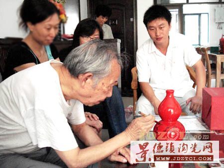 王錫良大師為“福祿平”葫蘆瓷瓶簽名(景德鎮(zhèn)在線資料圖片)