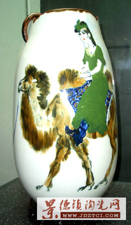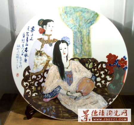 展品中的高溫顏色釉裝飾,是李菊生經(jīng)歷了多年艱難探尋,終于成功掌握了高溫顏色釉特點(diǎn),并用于裝飾人物的衣裙飾物、山石、鳥獸。這就大為拓展了陶瓷藝術(shù)的裝飾材料領(lǐng)域,極大地豐富了陶瓷藝術(shù)的裝飾語(yǔ)匯和表現(xiàn)手段,將藝術(shù)陶瓷的裝飾材質(zhì)提升了一個(gè)檔次。