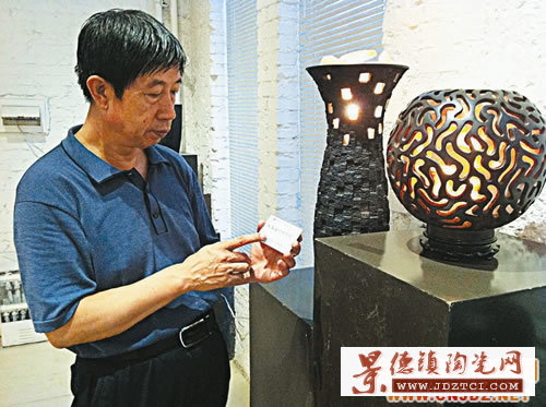 張福榮給記者介紹他入選“中國陶瓷藝術(shù)大師”時(shí)報(bào)送的水晶鹽黑陶臺(tái)燈系列